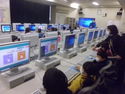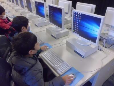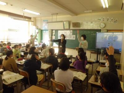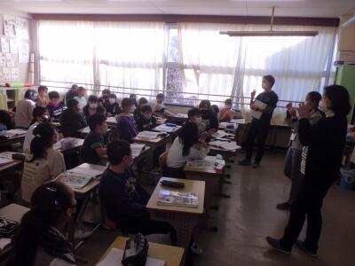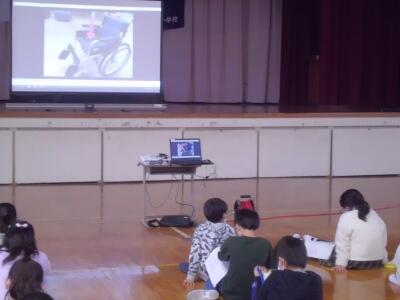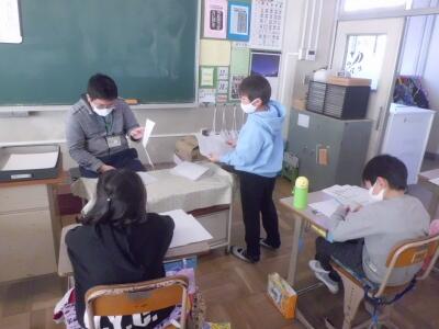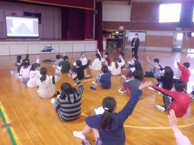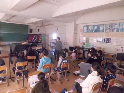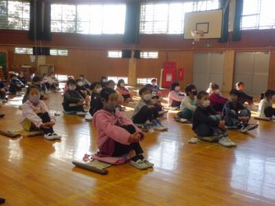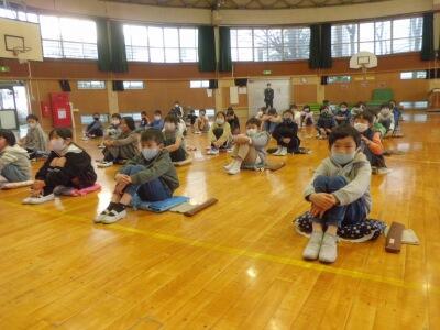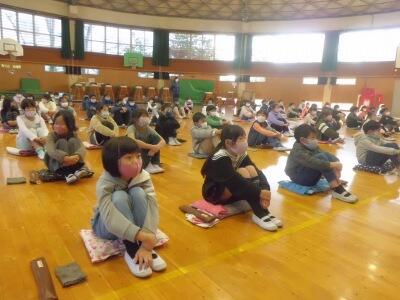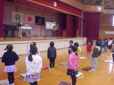体育館に全校児童が集まることができないため、Zoomを使ってオンライン終業式を行いました。