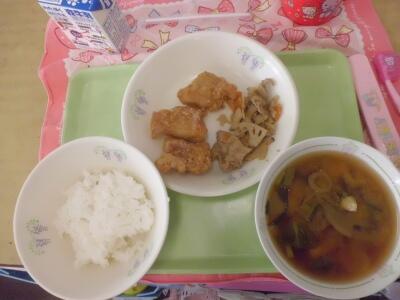 子どもたちの人気三大メニューの一つ、とり肉のから揚げをいただきます。