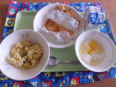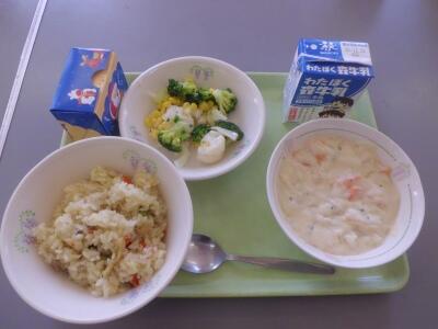 今日の給食は、牛乳、カレーピラフ、ホワイトソース、花野菜のサラダ、セレクトケーキです。
