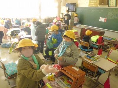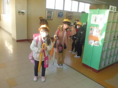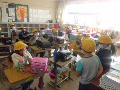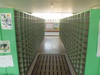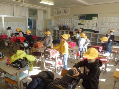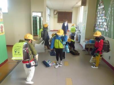 昇降口の1年生。今日は荷物が多いので上履きを履くのに一苦労です。