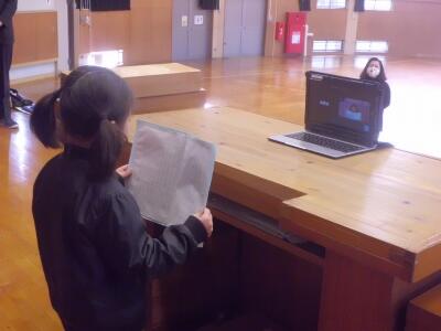担任の先生が見守る中、児童代表の言葉を読み上げます。