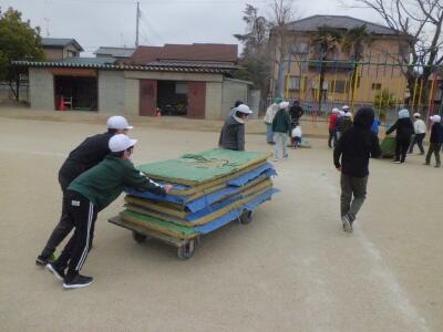 鉄棒の下のマットもしまいます。みんな素早い動きです。