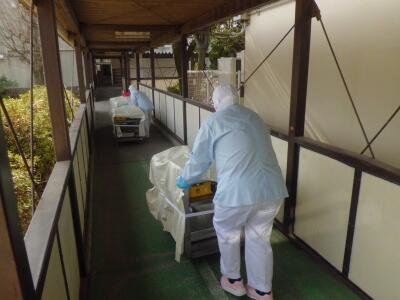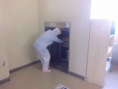 給食室のある北校舎から、調理員さんが南校舎まで運んでくれます。
