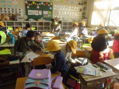 机の中の教科書やノートを、ランドセルの中に入れます。