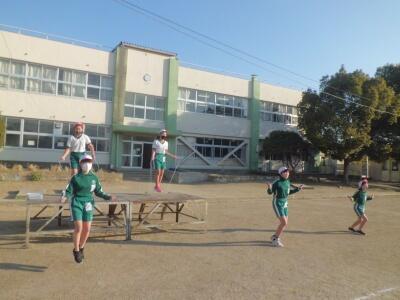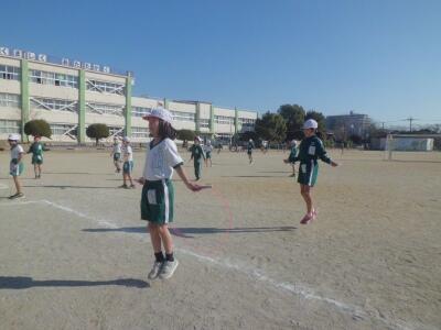 校庭では、2年生と5年生が元気タイムで短なわとびをしました。