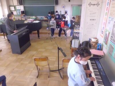 楽器のまわりで元気に遊ぶ子どもたちが見えます。