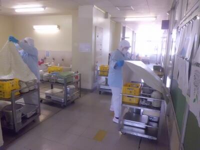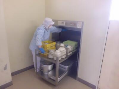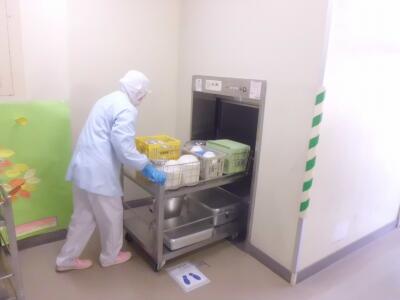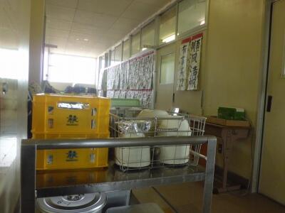 給食室のある北校舎から、調理員さんが南校舎まで運んでくれます。