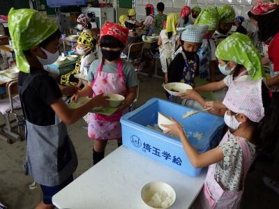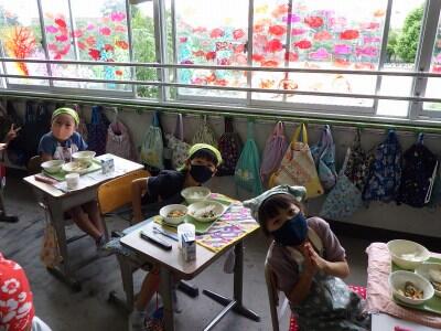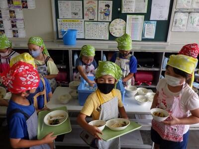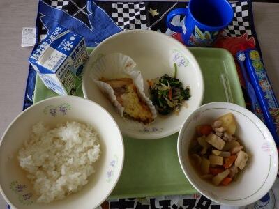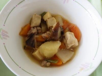 給食では、鶏肉、たけのこ、にんじん、じゃがいも、ごぼう、こんにゃく、干ししいたけ、いんげん、高野豆腐で作りました。