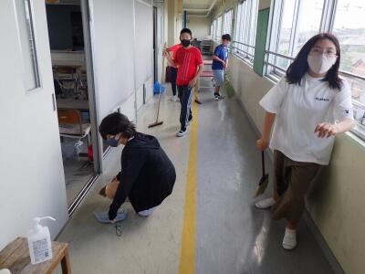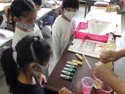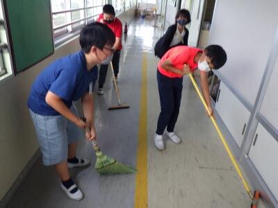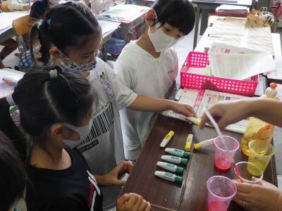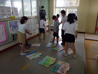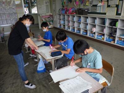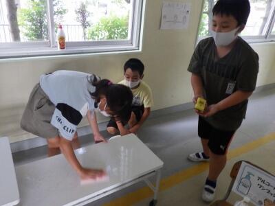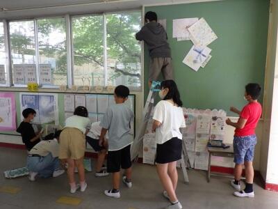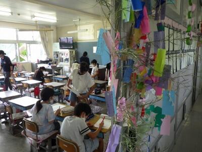 七夕飾りのある教室の中では、保健委員の児童が活動しています。