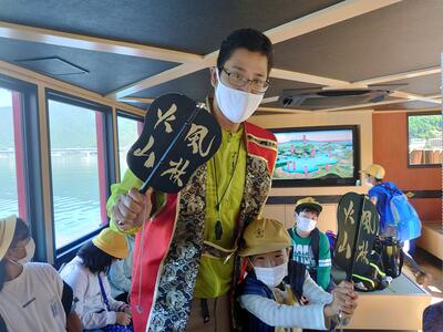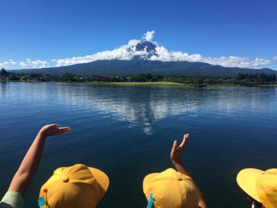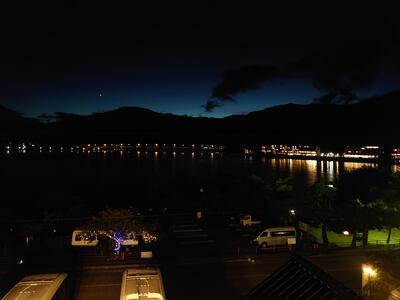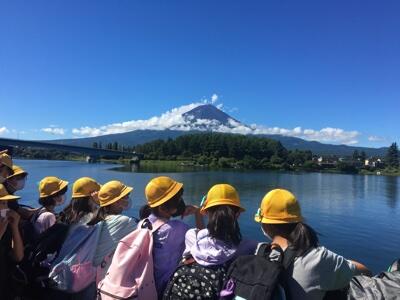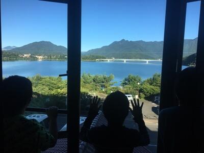 児童の部屋の窓からは、河口湖を見渡すことができます。夕食後、湖畔でキャンプファイヤーをする予定です。