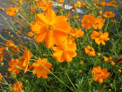コスモスの花が子どもたちを迎えます。