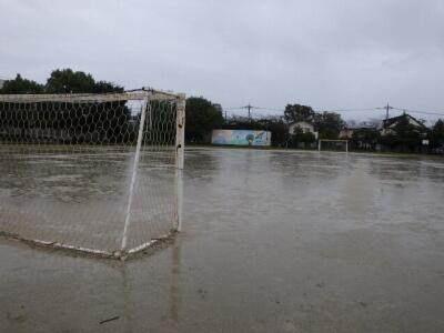 早朝から皆さんにご協力いただいて整備した校庭に、また雨が降り注いています。