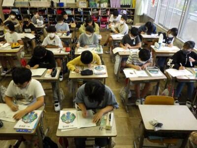 学校にいる生き物について、家の人に知らせる文を書きます。