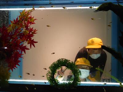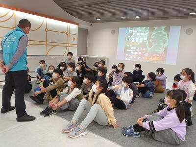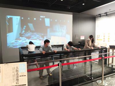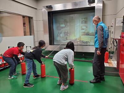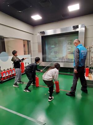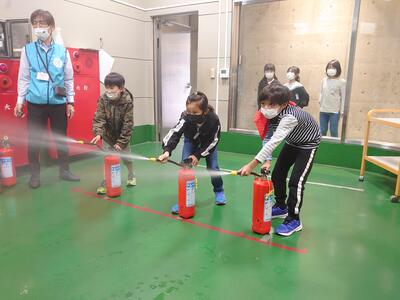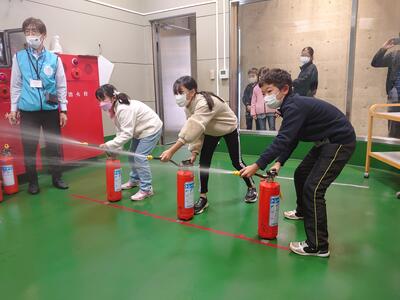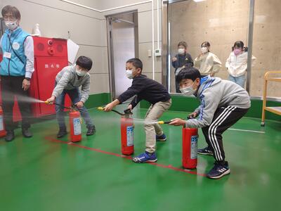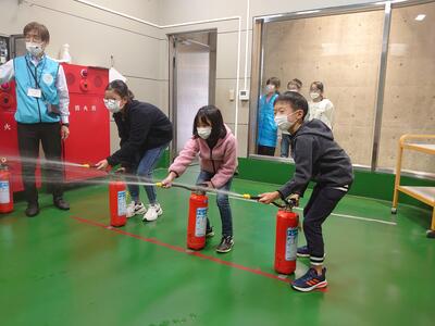 消火器体験は、火事が起きた想定で、映像に向かって放水します。