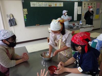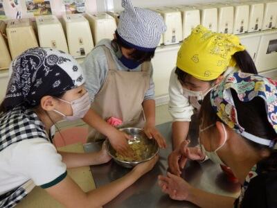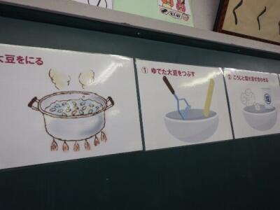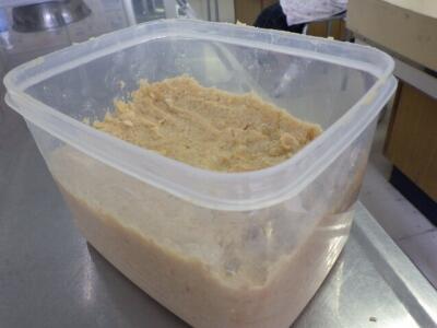 大豆を煮て、ゆでた大豆をつぶした後、こうじと塩を混ぜ合わせます。