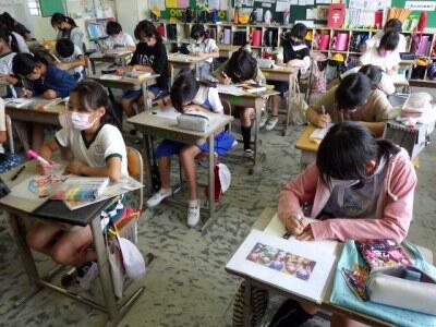 5時間目、6年生が公園橋のスケッチにやってきました。