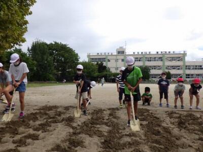 運動委員の児童が砂場掘りをしてくれています。