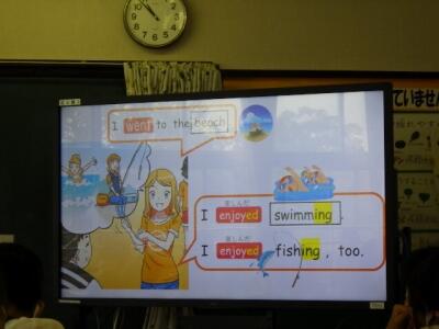 モニターの画面は先生の手作り教材です。