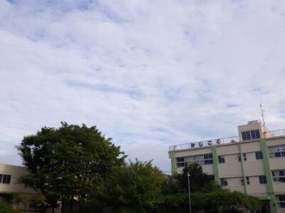 6時間目、体育館の上には青い空と白い雲が見えます。