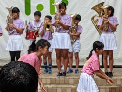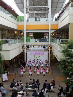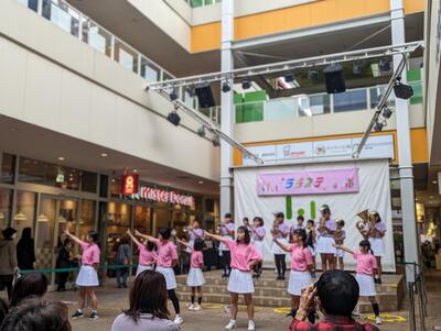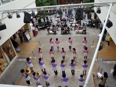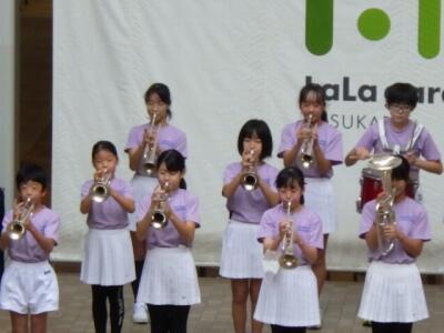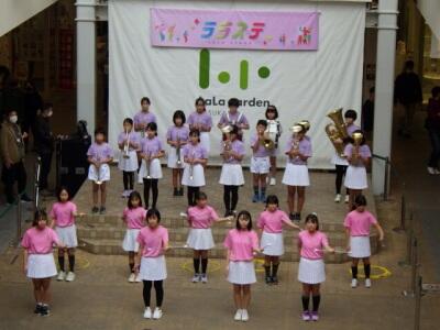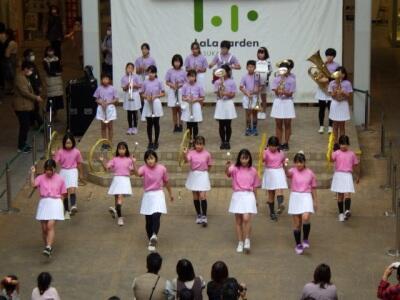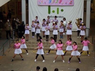 ララガーデンの15周年祭、「ララステ」のステージに、幸松小の金管バンドクラブ、バトン・ダンスクラブの児童が登場しました。