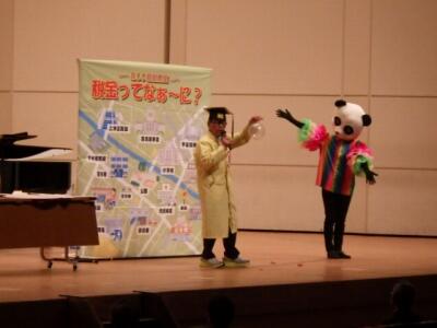 「租税教育と芸術文化鑑賞」と銘打って企画された取組であるため、演奏の後に税金ショーが始まりました。