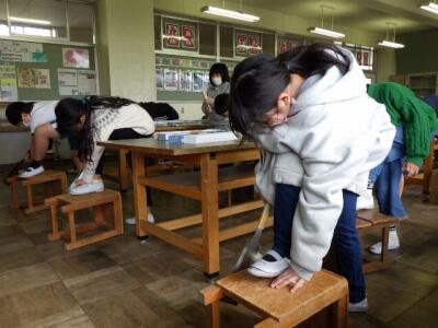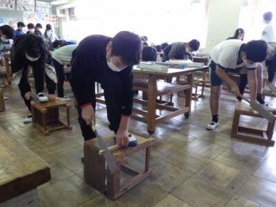 図工室の椅子は、のこぎりが使いやすいように作られています。