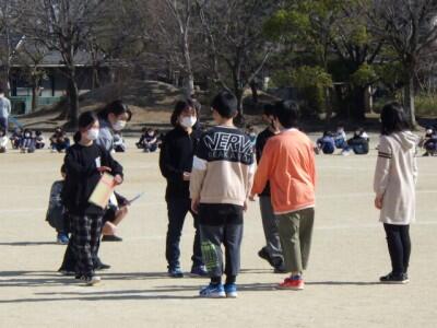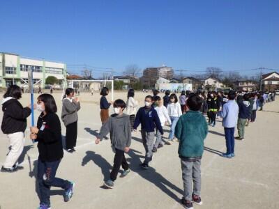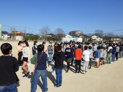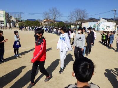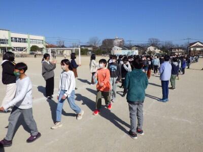 校庭に地区ごとに集まって、一斉下校を行いました。