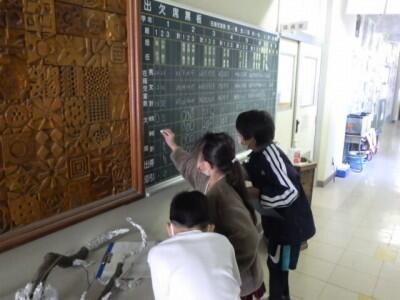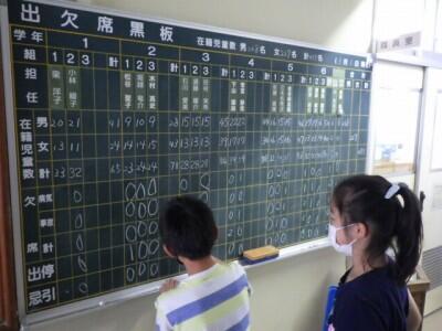 その日の出欠状況を、職員室前の黒板に記入します。