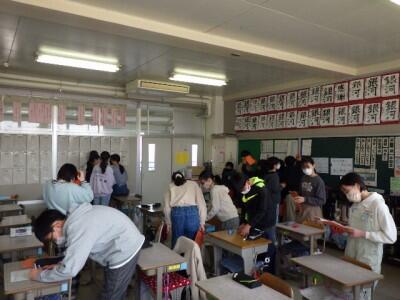 昼休みの6年生の教室。卒業制作の仕上げです。