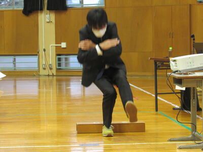 本校職員は、床の上10センチの板に座った状態から片足で立ち上がることができます。