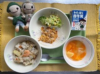 給食では、鶏がらスープと野菜の捨てる部分を煮だした出汁と牛乳で具材を煮て、みそで味をつけて汁物にしました。鶏がらと牛乳で、とてもコクのある味に仕上がりました。