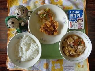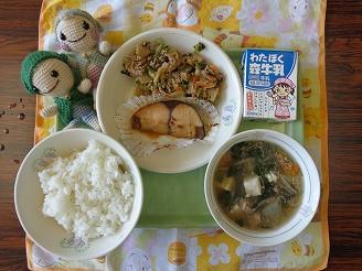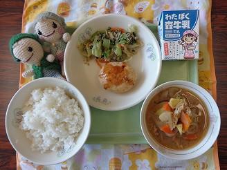 今日の給食のごはんは、幸松小の近くの田んぼでとれたお米です。5年生が5月に田植え、10月に稲刈りを体験しました。近くに住む白石さんが田んぼや稲を提供してくれ、農協の方々が田植えや稲刈りのしかたを教えに来てくれました。