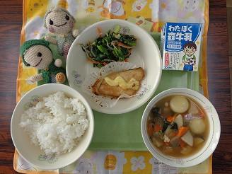 「イガメンチ」は、イカのメンチがなまった青森県津軽地方の郷土料理です。「けの汁」は、青森県の女性たちが小正月をくつろぐために作り置きができる料理として作られたもので、「粥の汁」がなまって「けの汁」になりました。「りんごゼリー」は、青森県の特産品であるりんごにちなんで給食室でりんごゼリーを作りました。