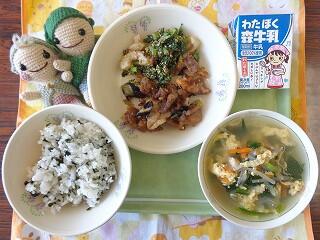 6年生が考えた献立です。みんなの苦手なナスを豚肉と甘辛な味付けで食べやすく工夫された料理と、旬の野菜をたくさん使ったバランスの良い献立です。