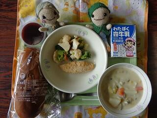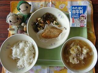 今日は北海道の献立です。ザンギは、にんにく・しょうが醤油に漬けこんだ鶏肉にかたくり粉をまぶして油で揚げた料理です。三平汁には、北海道の特産品のじゃがいも、鮭、昆布が入った白みそ仕立ての汁物です。