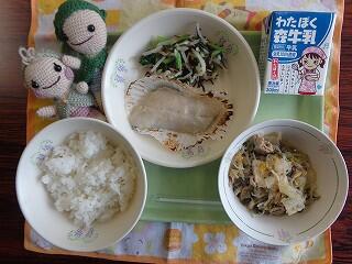 明日は節分です。今日は、1日早い節分献立です。節分に食べる風習のあるいわしと大豆を使った献立です。大豆は節分汁に入っています。