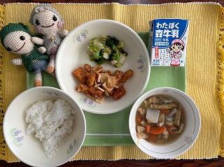 いかのかりん揚げは、下味をつけたイカと、お湯で戻した凍り豆腐のうす切りに片栗粉をまぶして揚げて、甘辛いたれをからめたものです。揚げた凍り豆腐がサクサクとした歯ごたえで、どのクラスも、とてもよく食べていました。
