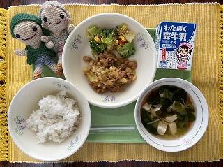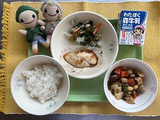 今日の給食では、この全国学校給食週間にちなみ、「鮭の塩焼き」や、青菜(小松菜)を使った「いそ和え」を出しました。
