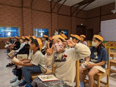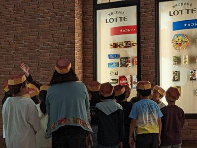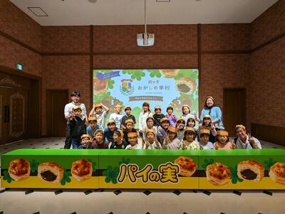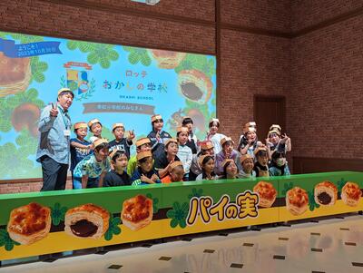 「パイの実」帽子をかぶって、ロッテのおかしの作り方を学んでいるよ。
