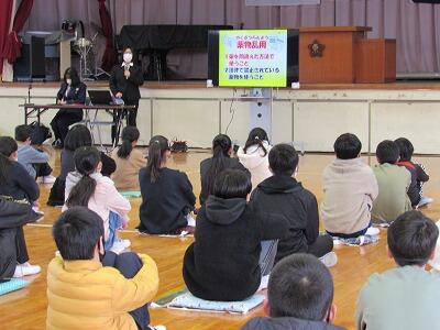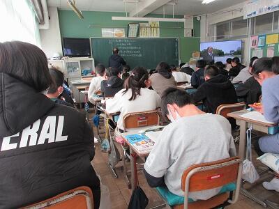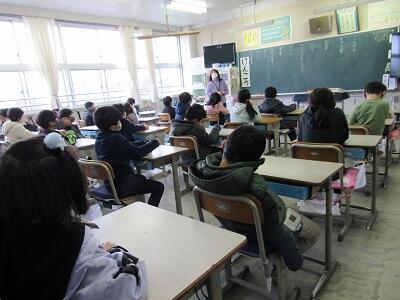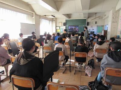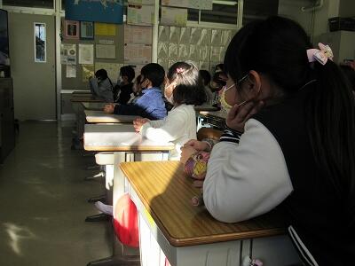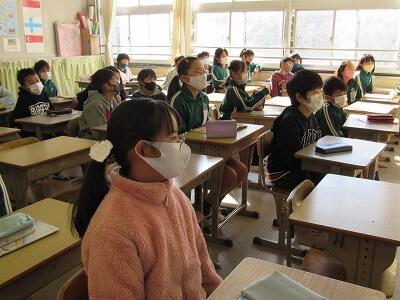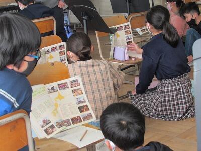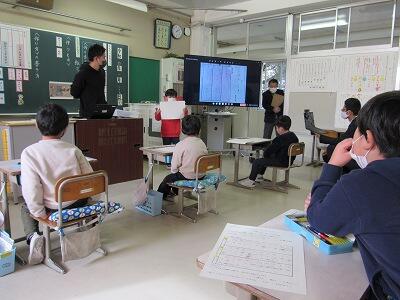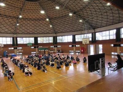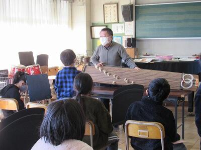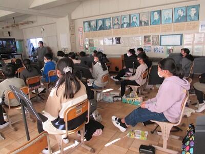 ◆4年生が音楽室で、伝統芸能を鑑賞しているよ。