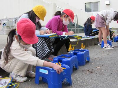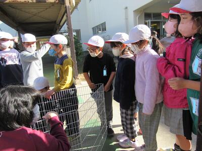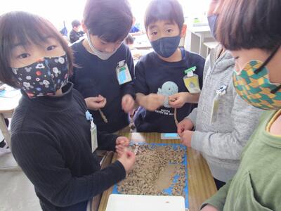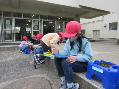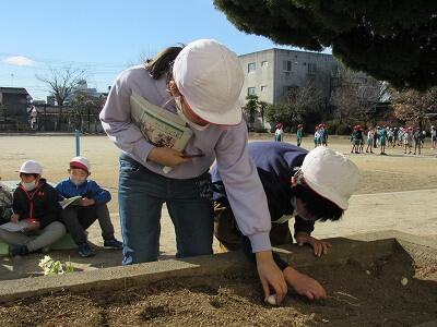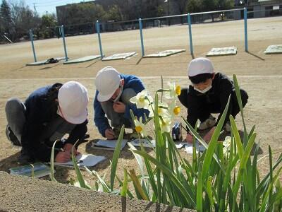 ◆4年生は、冬の動植物を観察するため、校庭へ出てきているよ。