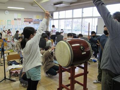 ばちの持ち方、和太鼓の叩く強さ、リズムなどを演奏を通して身に付けているね。