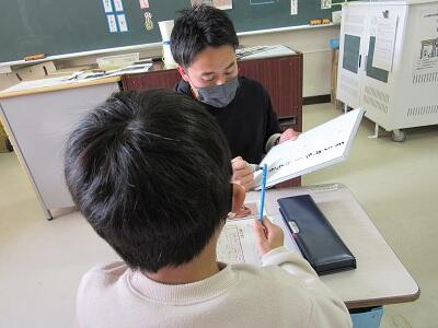 ◆6年生は、3学期の目標をじっくりと考え、先生と言葉を整えているよ。