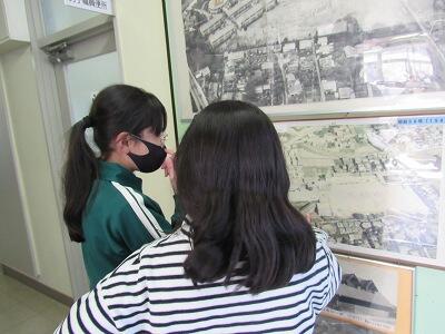 ◆昼休み、校長室前の写真を見に来ている5年生。「門の位置などが違っているね。」