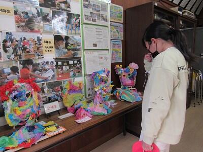校長室の作品を鑑賞しに4年生が来ています。「うわあ、2年生でこのような作品作ったかなあ。」