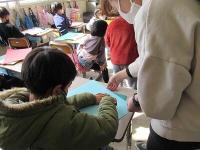 初めてカッターナイフを使います。色画用紙を切るとき、気をつけてね。