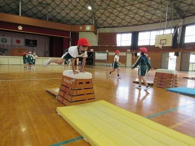 初めての「跳び箱遊び」に挑戦中。とても楽しそうに演技しているね。