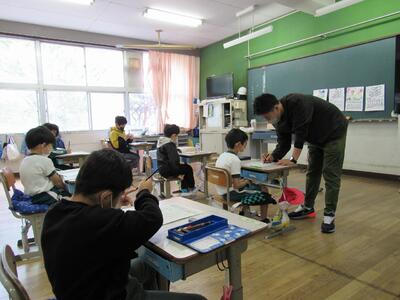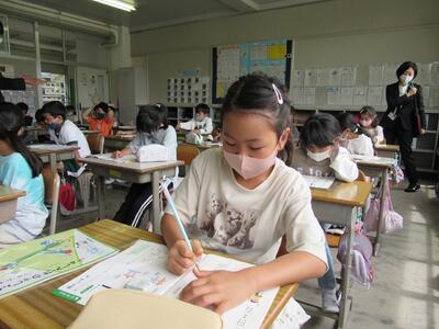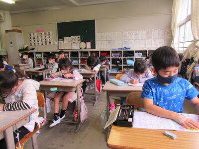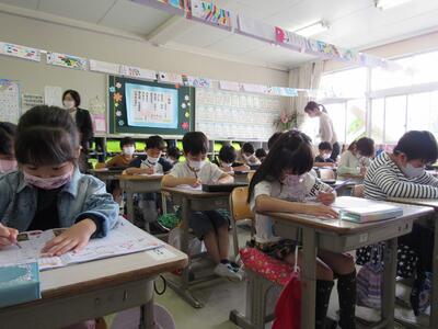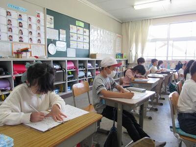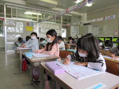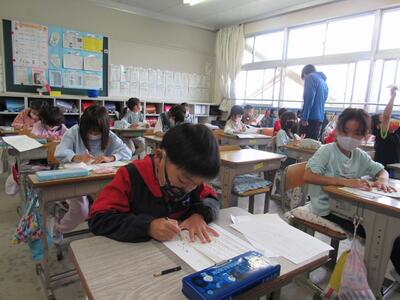 ◆今日は、多くの学年で硬筆の競書会をむかえているよ。ここは2年生!!