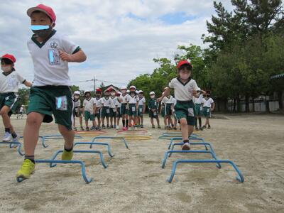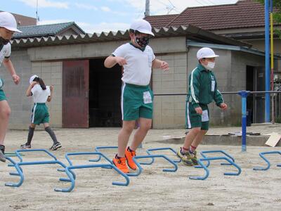 ◆2年生は、ミニハードルなどをピョンピョンと飛び越えているよ。
