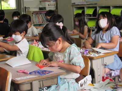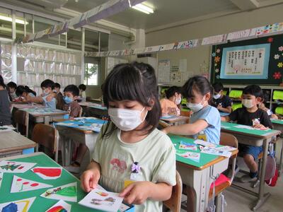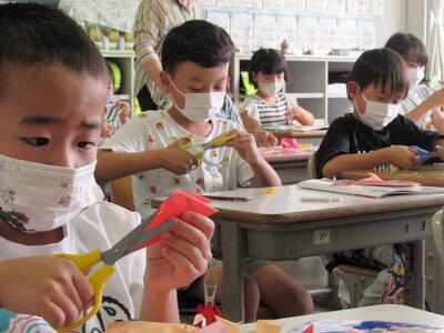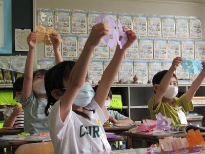 ◆1年生は、折り紙を折って、切って、開いて、すてきなデザインを表現しているよ。
